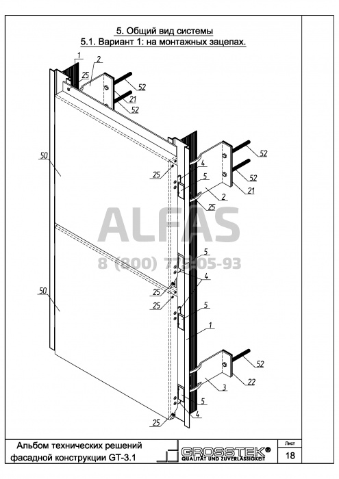 Все части фасадной системы Grosstek GT-3.1 изготавливают из алюминиевого сплава, что делает конструкцию легкой и прочной. Вследствие легкости конструкции, нагрузка на несущую стену ощутимо меньше, чем у систем из других материалов, притом, что сама система способна выдерживать большой вес облицовочного материала.